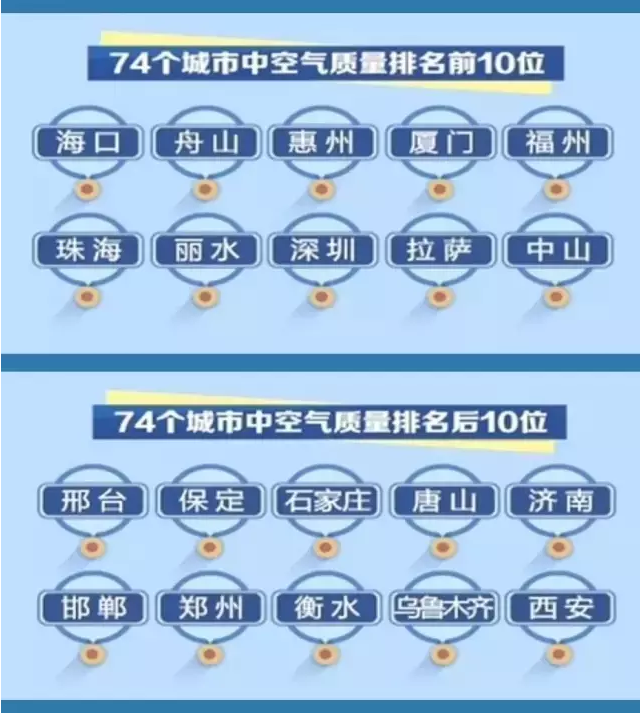 在74個(gè)城市中,空氣質(zhì)量排名前10位的是:??凇⒅凵?、惠州、廈門、福州、珠海、麗水、深圳、拉薩和中山市。