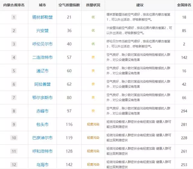以上數(shù)據(jù)是今天內(nèi)蒙古12盟市空氣質(zhì)量指數(shù)排名和全國(guó)空氣質(zhì)量指數(shù)排名