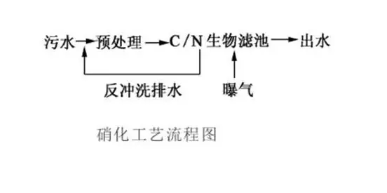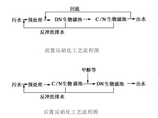 后置反硝化是廢水首先經(jīng)過硝化濾池或濾池的好氧段,出水進(jìn)入DN濾池或濾池的DN段,后置脫氮技術(shù)不利的一面是需要外加碳源,運(yùn)行成本相對較高,同時如何投加適當(dāng)劑量的碳,需要可靠的控制和穩(wěn)定的進(jìn)水濃度,同時出水需要進(jìn)行曝氣去除過量的碳。典型反硝化流程: