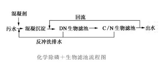 該工藝優(yōu)點(diǎn)是工藝流程簡單,控制方便;但藥劑耗量較大,剩余污泥較多,同時由于混凝沉淀去除一部分有機(jī)物,有可能引起后續(xù)反硝化碳源不足。另外一種是同步沉淀與絮凝過濾,即在曝氣生物濾池中投加化學(xué)藥劑,沉淀物積聚在填料中,通過周期性反沖洗,將磷排出系統(tǒng)外,達(dá)到除磷的目的,該工藝藥劑量相對較小,但是污泥被截留在曝氣生物濾池內(nèi),會縮短生物濾池的運(yùn)行周期,增加反沖洗的頻率。